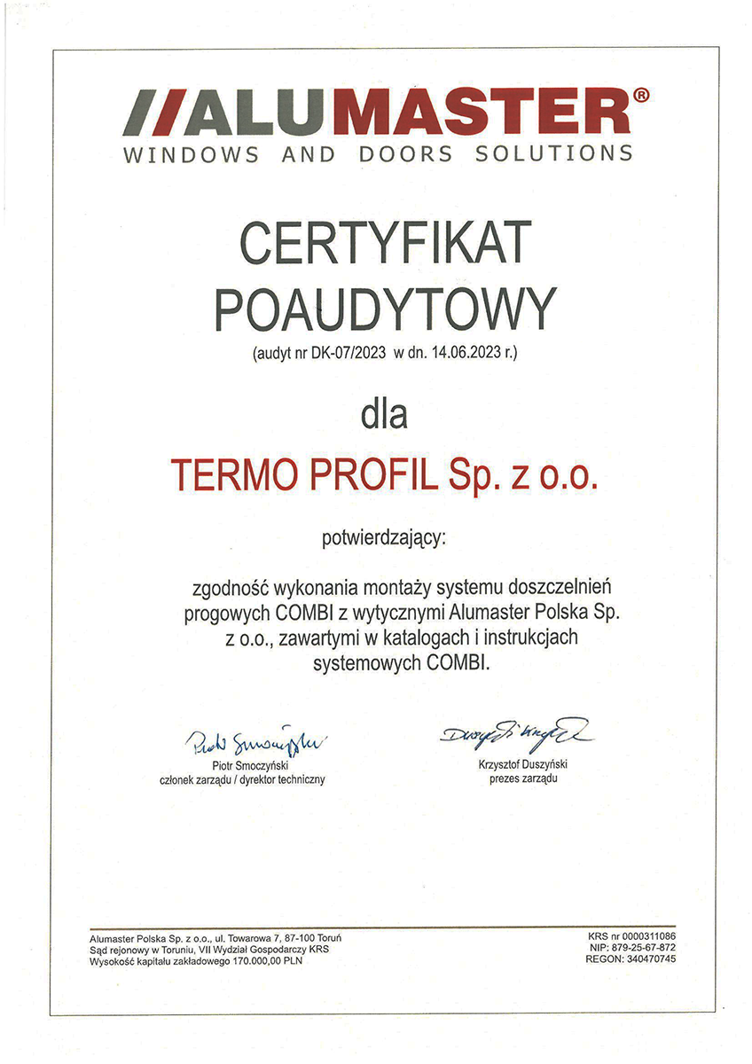 S potěšením oznamujeme, že dne 14. června 2023 společnost Termo Profil obdržela certifikát po auditu od společnosti ALUMASTER Polska Sp. z o. o.